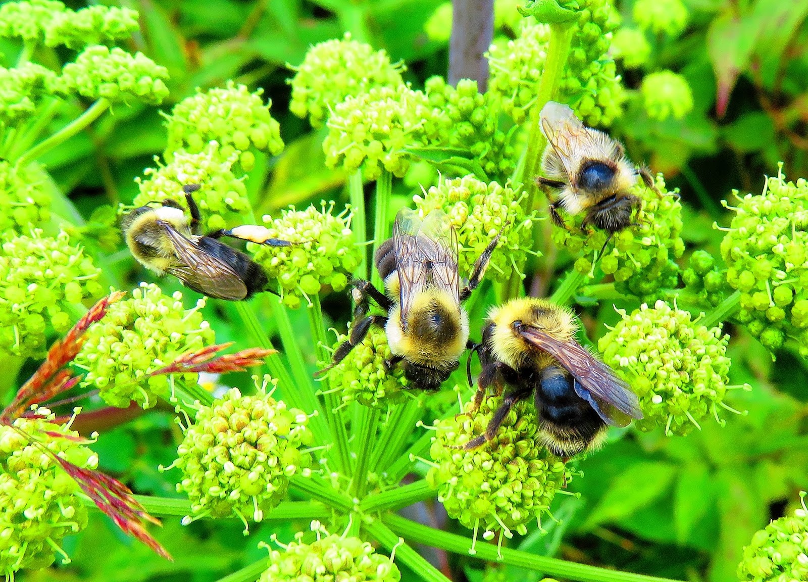 | "Drunk" Bumble Bees on Mountain Angelica. |